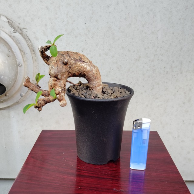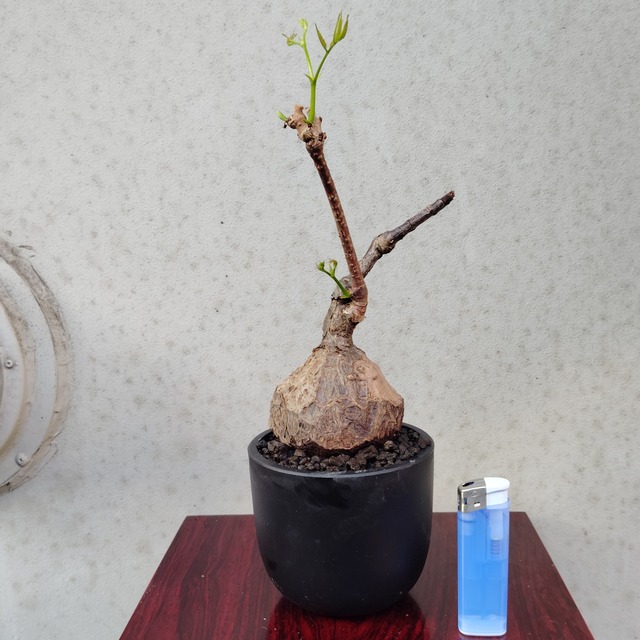 小さいながらも古木感が凄いキフォステンマパキプス現地球です。 比較対象として、高さ約8cm幅約2cmのライターを置いています。 色んな角度からの写真を載せていますので、どうぞご覧ください。 【学名】 Cyphostemma pachypus 【原産地】 マダガスカル 【お世話】 キフォステンマ パキプスは夏型塊根植物と呼ばれています。 日本では春から秋が成長期なので、日当たりと風通しの良い所に置いて、用土が乾いたらたっぷりと水を与えて下さい。 ※水の与えすぎは根腐れの原因になります。注意して下さい。 キフォステンマ パキプスは、日光が不足すると徒長や腐敗しやすいので日当たりには注意して下さい。 寒くなり、葉を落として来たら休眠に入るので、なるべく10℃を下回らない所に置いて、月に数回ごく少量の水を与え、細根の枯死を防いで下さい。 肥料は成長期に数回、規定量よりも薄めた液肥を与えるか、植え替える時にマグァンプK等の媛効性肥料を少量混ぜ込んで下さい。