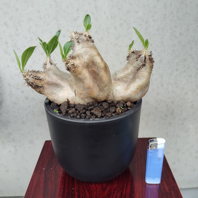 かわいらしい三つ子ちゃん! 3頭のパキポディウム エブルネウム現地球です。 比較対象として、高さ約8cm幅約2cmのライターを置いています。 色んな角度からの写真を載せていますので、どうぞご覧ください。 【学名】 Pachypodium eburneum 【原産地】 マダガスカル 【お世話】 パキポディウム エブルネウムは夏型塊根植物と呼ばれています。 日本では春から秋が成長期なので、日当たりと風通しの良い所に置いて、用土が乾いたらたっぷりと水を与えて下さい。 ※水の与えすぎは根腐れの原因になります。注意して下さい。 パキポディウム エブルネウムは高山種なので真夏には遮光してあげると良いです。寒くなり、葉を落として来たら休眠に入るので、なるべく10℃を下回らない所に置いて、月に数回ごく少量の水を与え、細根の枯死を防いで下さい。 肥料は成長期に数回、規定量よりも薄めた液肥を与えるか、植え替える時にマグァンプK等の媛効性肥料を少量混ぜ込んで下さい。
