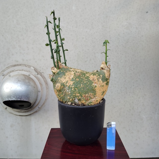 凄く面白い形をしたユーフォルビア イトレメンシス現地球コレクション株です。 比較対象として、高さ約8cm幅約2cmのライターを置いています。 色んな角度からの写真を載せていますので、どうぞご覧ください。 【学名】 Euphorbia itremensis 【原産地】 マダガスカル 【お世話】 ユーフォルビア イトレメンシスは夏型塊根植物と呼ばれています。 日本では春から秋が成長期なので、日当たりと風通しの良い所に置いて、用土が乾いたらたっぷりと水を与えて下さい。 ※水の与えすぎは根腐れの原因になります。注意して下さい。 ユーフォルビア イトレメンシスは現地では、塊根部分は土に埋まっています。太陽光によって株が弱ってしまう事があるので、寒冷紗を用いて真夏は遮光してあげると良いです。 寒くなり、葉を落として来たら休眠に入るので、なるべく10℃を下回らない所に置いて、月に数回ごく少量の水を与え、細根の枯死を防いで下さい。 肥料は成長期に数回、規定量よりも薄めた液肥を与えるか、植え替える時にマグァンプK等の媛効性肥料を少量混ぜ込んで下さい。