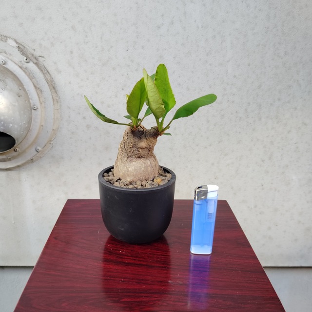 かわいらしい形をしたユーフォルビア スバポーダ現地球です。 比較対象として、高さ約8cm幅約2cmのライターを置いています。 色んな角度からの写真を載せていますので、どうぞご覧ください。 【学名】 Euphorbia subapoda 【原産地】 マダガスカル 【お世話】 ユーフォルビア スバポーダは夏型塊根植物と呼ばれています。 日本では春から秋が成長期なので、日当たりと風通しの良い所に置いて、用土が乾いたらたっぷりと水を与えて下さい。 ※水の与えすぎは根腐れの原因になります。注意して下さい。 ユーフォルビア スバポーダは現地では、塊根部分は土に埋まっています。太陽光によって株が弱ってしまう事があるので、寒冷紗を用いて真夏は遮光してあげると良いです。 寒くなり、葉を落として来たら休眠に入るので、なるべく10℃を下回らない所に置いて、月に数回ごく少量の水を与え、細根の枯死を防いで下さい。 肥料は成長期に数回、規定量よりも薄めた液肥を与えるか、植え替える時にマグァンプK等の媛効性肥料を少量混ぜ込んで下さい。