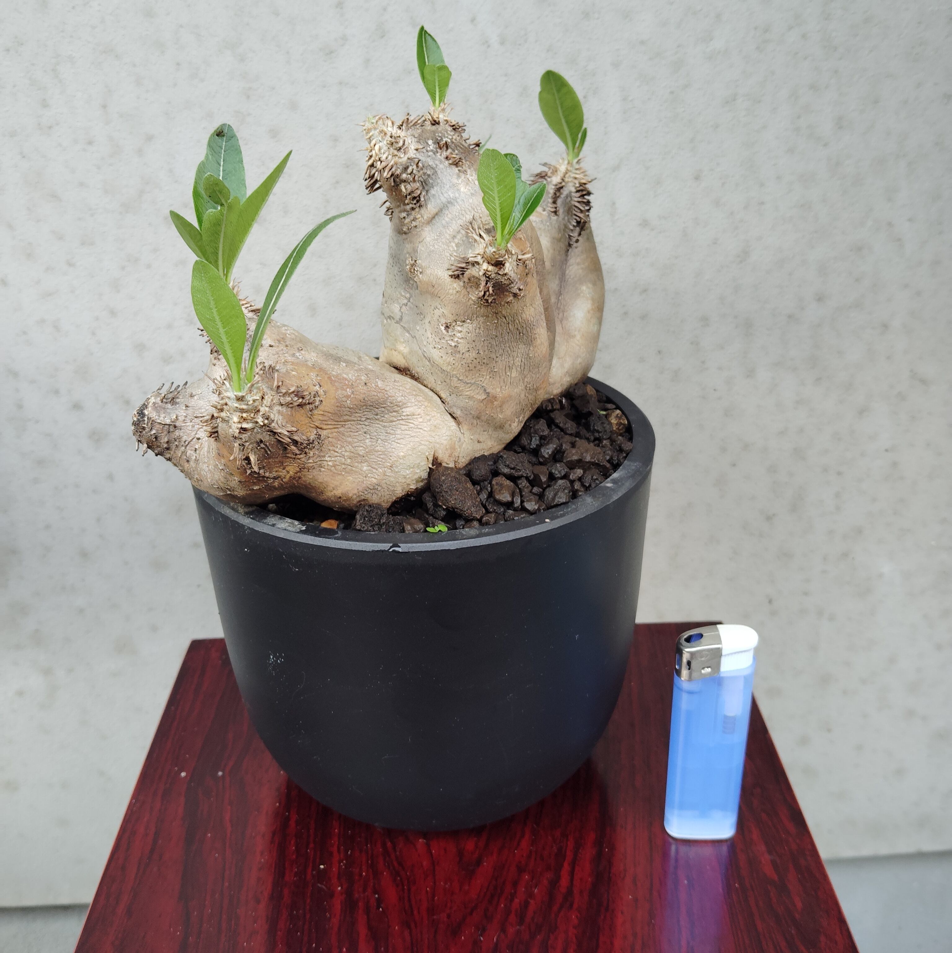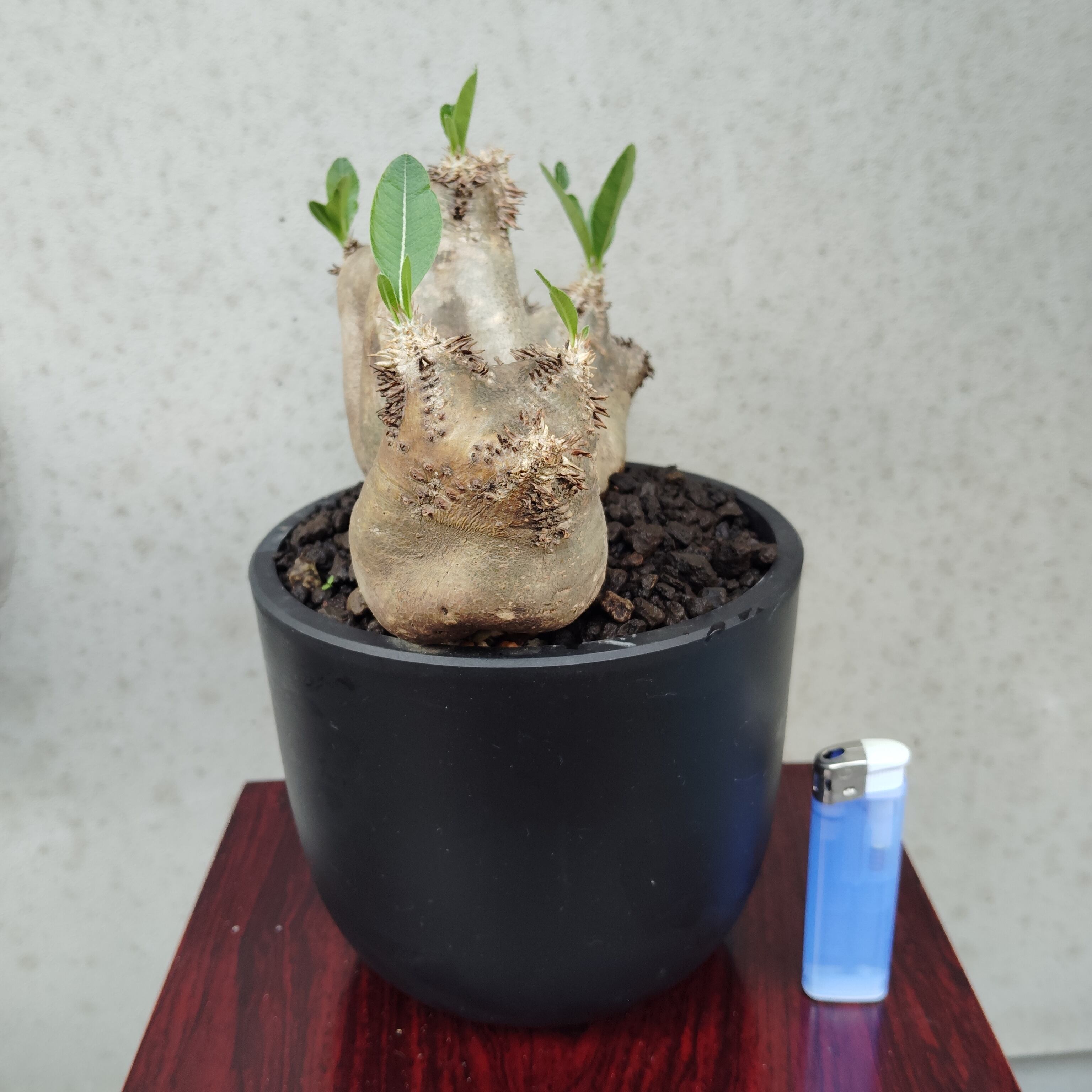 パキポディウム エブルネウムは高山種なので真夏には遮光してあげると良いです。寒くなり、葉を落として来たら休眠に入るので、なるべく10℃を下回らない所に置いて、月に数回ごく少量の水を与え、細根の枯死を防いで下さい。